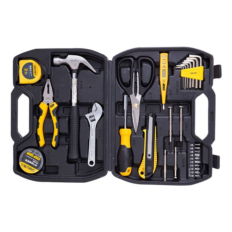 31 інструмент — компактний набір для точних робіт. У комплекті: плоскі шестигранники, набір викруток, викрутки Pozidriv, годинникові викрутки, цифровий тестер, канцелярський ніж, розвідний ключ, молоток, кусачки, рулетка, ізоляційна стрічка та біта PH1 з рукояткою. Ідеально для електроніки, ремонту та щоденних задач.