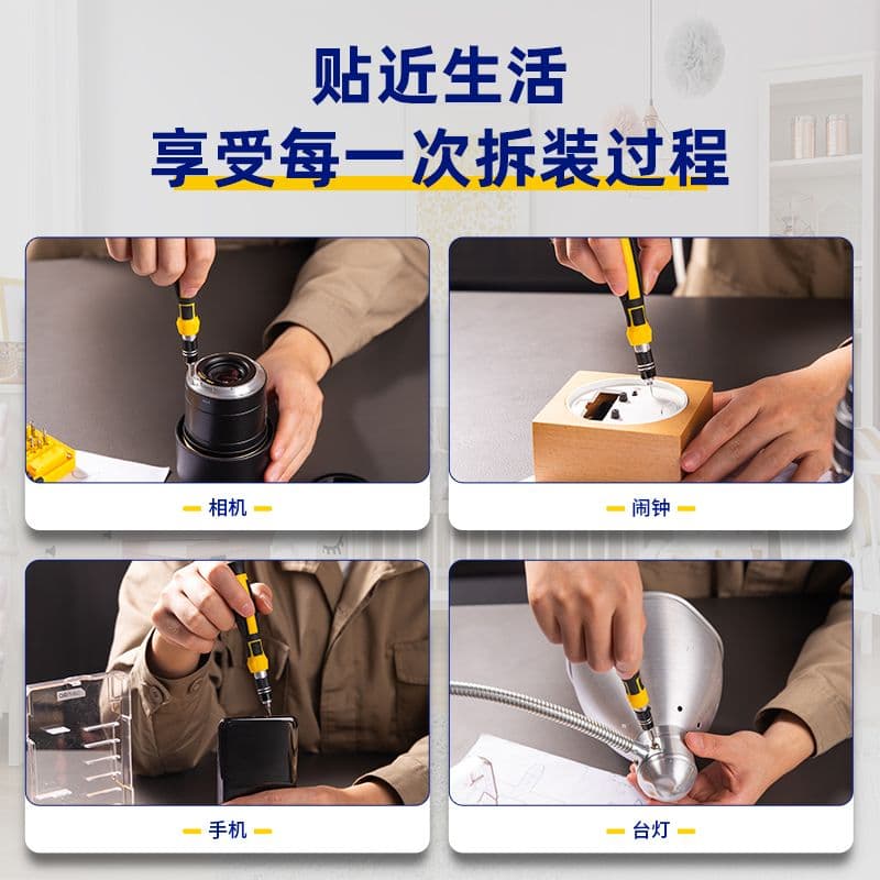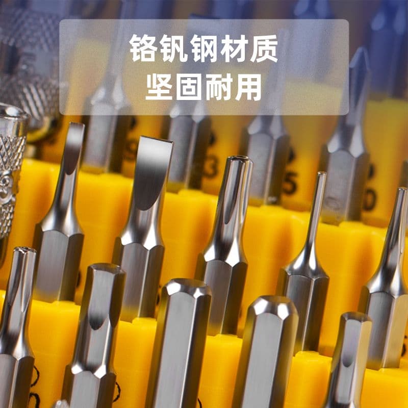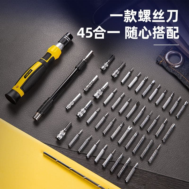45 прецизійних насадок — один розумний набір! У комплекті: шліцеві, Philips, Torx, шестигранні, трикутні, зірчасті, U-тип, Y-тип і торцеві головки — плюс телескопічна ручка, подовжувач і гнучкий шланг. Ідеально для iPhone, iPad та точної електроніки. Упаковано в міцний пластиковий кейс — готовий до кожного дрібного гвинтика.