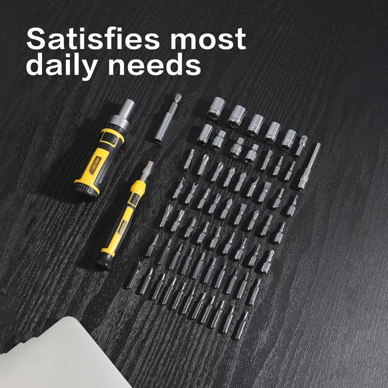 65 прецизійних інструментів — компактна потужність у кейсі! У наборі: шліцеві, Philips, Torx, Pozidriv, шестигранні, трикутні, U-тип, Y-тип, зірчасті насадки, торцеві головки, подовжувачі, з'єднувач і тріщотковий ключ 6,3 мм. Ідеально для електроніки, механіки та точних робіт — усе в міцному пластиковому кейсі.