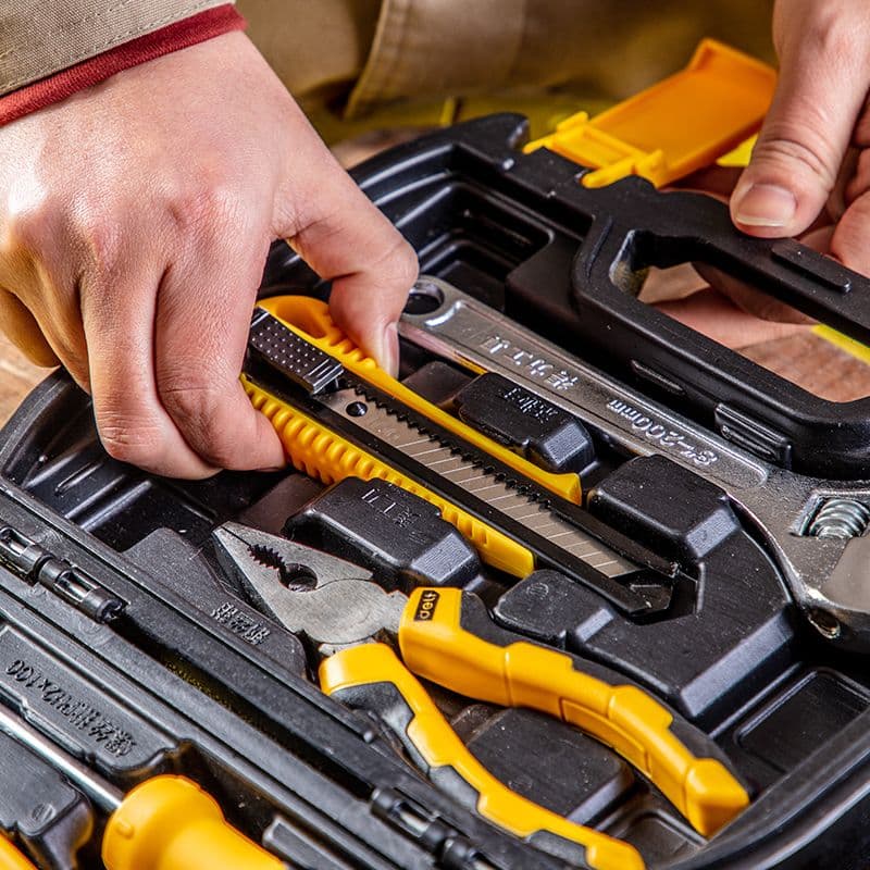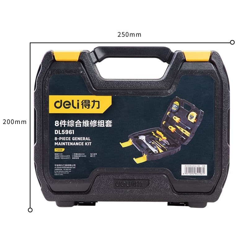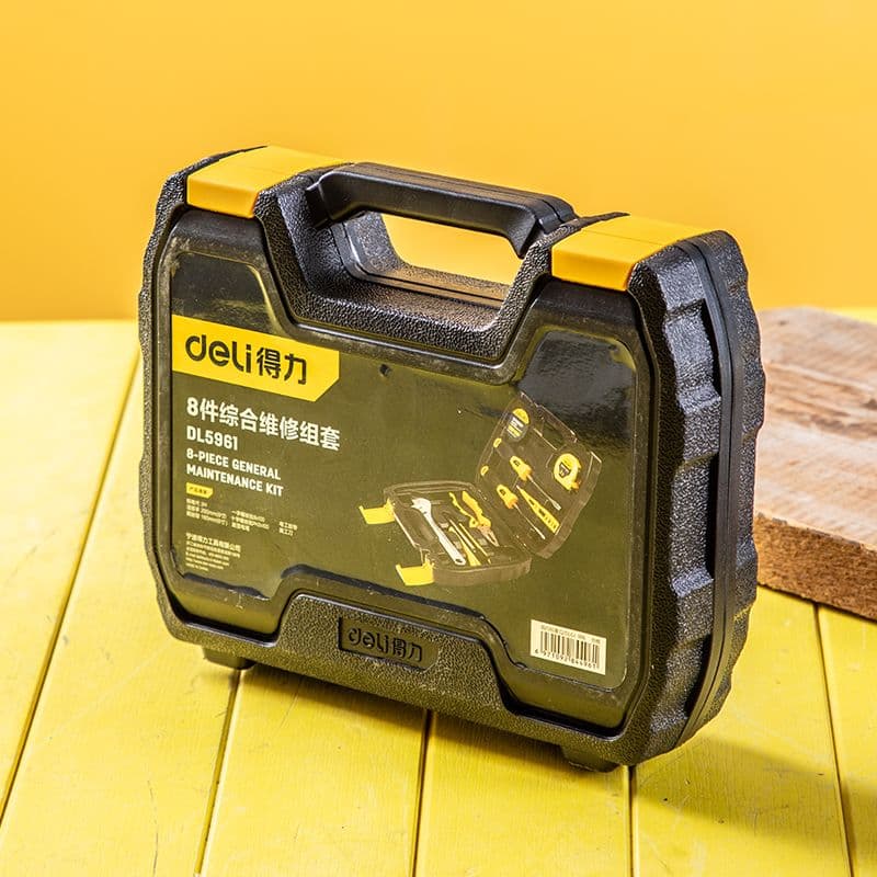 8 інструментів — компактний стартовий набір. У комплекті: шліцева та хрестова викрутки, канцелярський ніж, розвідний ключ 200 мм, кусачки 160 мм, рулетка 2 м, ізоляційна стрічка та ящик для зберігання. Ідеально для базового ремонту, DIY і щоденних задач.