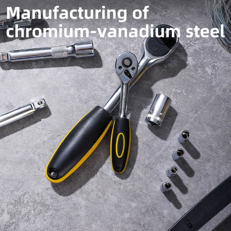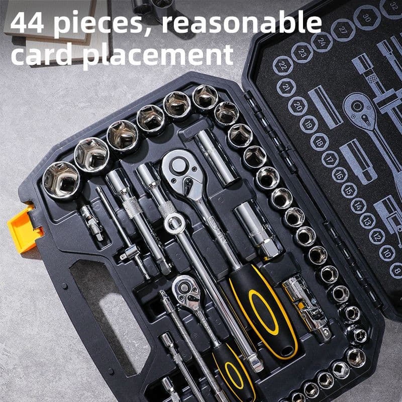 Точність і сила — тріщотки 45 T у форматах 1/4 " і 1/2 ". Набір із хромованадієвої сталі: карданні шарніри, Т-подібні ручки, гнучкі подовжувачі, головки для свічок запалювання та 31 торцева головка (стандартні й подовжені). Упаковано в міцний пластиковий кейс — створено для майстрів, готове до серйозного навантаження.