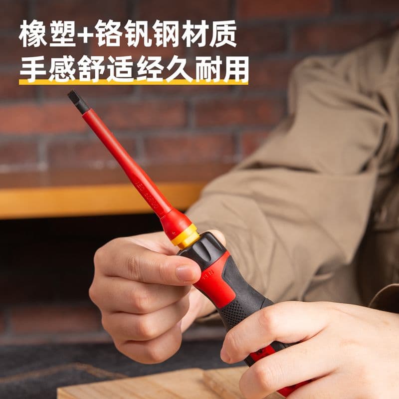 Ізольований набір для безпечної електромонтажної роботи — до 1000 В. У комплекті: шліцеві та Philips ізольовані викрутки, гумова ручка та ключі для трикутних і квадратних електричних коробок. Виготовлено з хромованадієвої сталі, упаковано в картонну коробку — компактно, безпечно, готово до роботи.