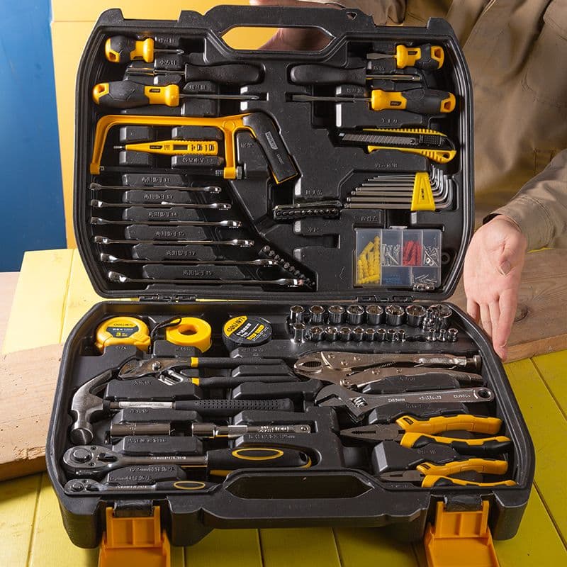 155 інструментів — повна майстерня в одному наборі! У комплекті: торцеві головки (1/4", 3/8"), тріщотка, подовжувачі, кардан, шестигранники, рожкові ключі, ізольовані та стандартні викрутки, тримач і набір біт (PH, SL, PZ, Torx, Hex, Spline), плоскогубці, бокорізи, довгогубці, розвідні ключі, рулетка, тестер, молоток, канцелярський ніж із лезами, ізоляційна стрічка, кріплення, кабельні стяжки, лупа та мікроінструменти для електроніки. Упаковано для професіоналів — готове до роботи вдома, в гаражі чи в польових умовах.