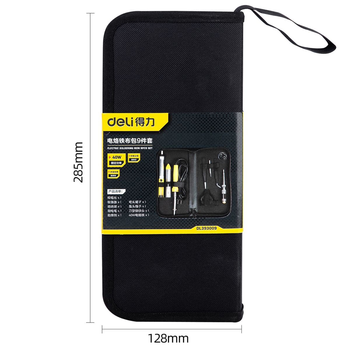 Набір для пайки 9 предметів Deli DL393009 — швидкий нагрів і точна робота. У комплекті: паяльник 40 Вт із двошаровим слюдяним нагрівальним елементом, поглинач припою, олов’яний дріт, пінцети (вигнутий і прямий), тестер напруги (100 – 500 В), жало ножового типу, підставка для паяльника та пастоподібний флюс. Ідеально для електроніки, ремонту та точних паяльних робіт.