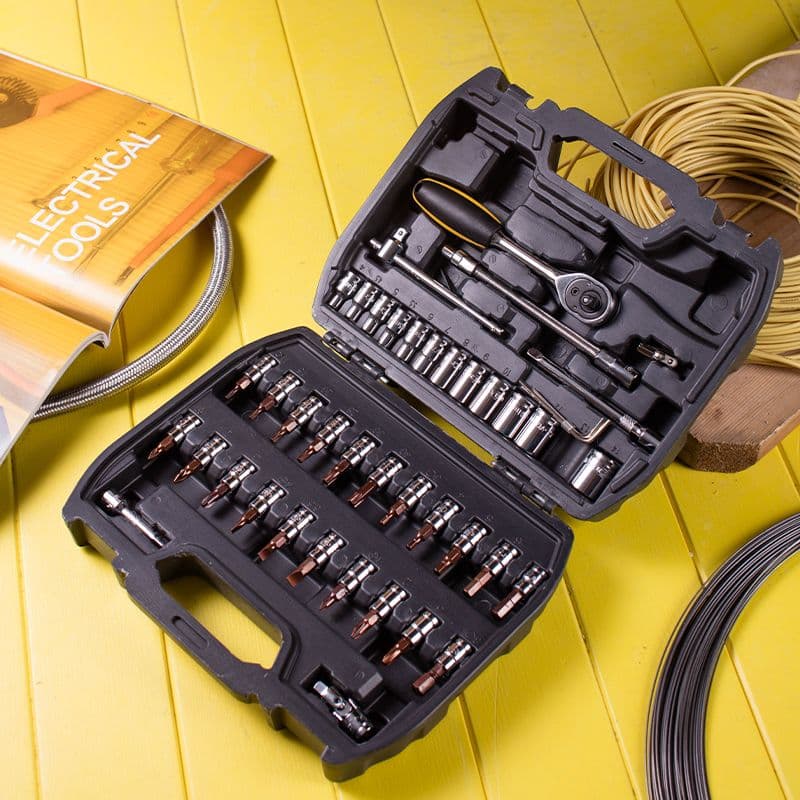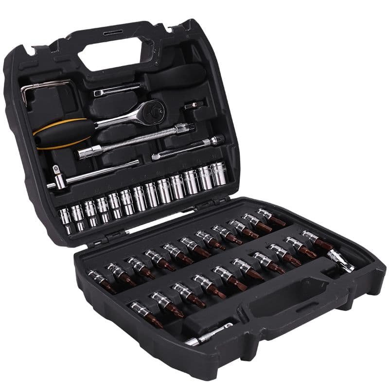 Компактний та універсальний — цей набір із 46 предметів створений для точності та міцності. Виготовлений із термічно обробленої Cr-V сталі, він містить кардан, ковзний вороток, обертовий стержень, тріскачку, подовжувачі, шестигранні ключі, 13 головок (4 – 14 мм) та 21 біт для будь-яких завдань. Упакований у міцний пластиковий кейс — ідеальний помічник для майстрів, домашніх робіт та щоденного використання.