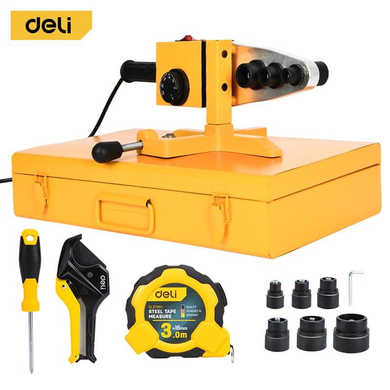 Потужний паяльник для пластикових труб PPR, PB і PE. Регульована температура та шість змінних насадок забезпечують надійне зʼєднання в широкому діапазоні діаметрів. Упакований у міцний металевий ящик — готовий до роботи на обʼєкті чи в майстерні.