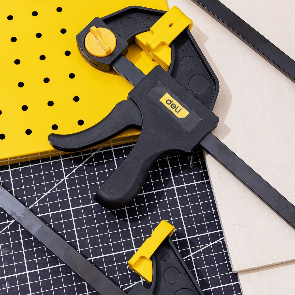 Міцна та зручна — швидкозатискна струбцина 30 см (63 × 300 мм) забезпечує силу затиску до 90 Н. Триггерний механізм із гумовими губками гарантує надійне утримання та легке використання. Упакована з етикеткою — практичний інструмент для столярних робіт, монтажу та DIY-проєктів.